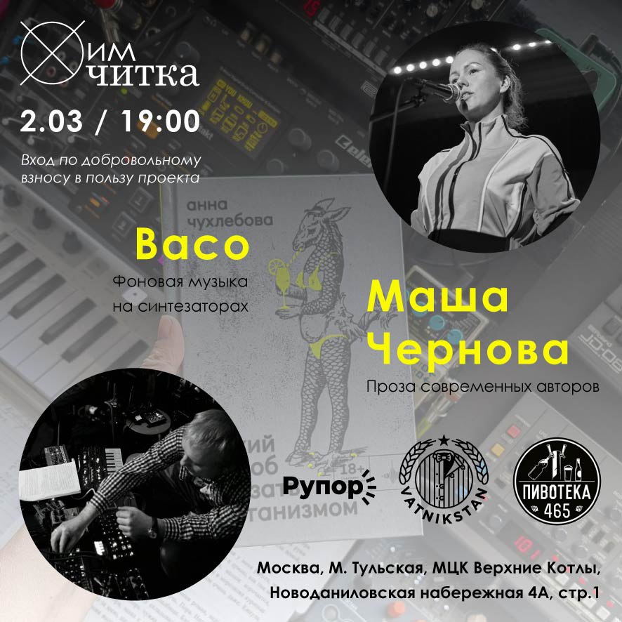 В этот раз под фоновую синтезаторную музыку в исполнении Васо прозвучит несколько рассказов Анны Чухлебовой из сборника «Лёгкий способ завязать с сатанизмом». Произведения прочитает Маша Чернова, основательница «ХимЧитки».