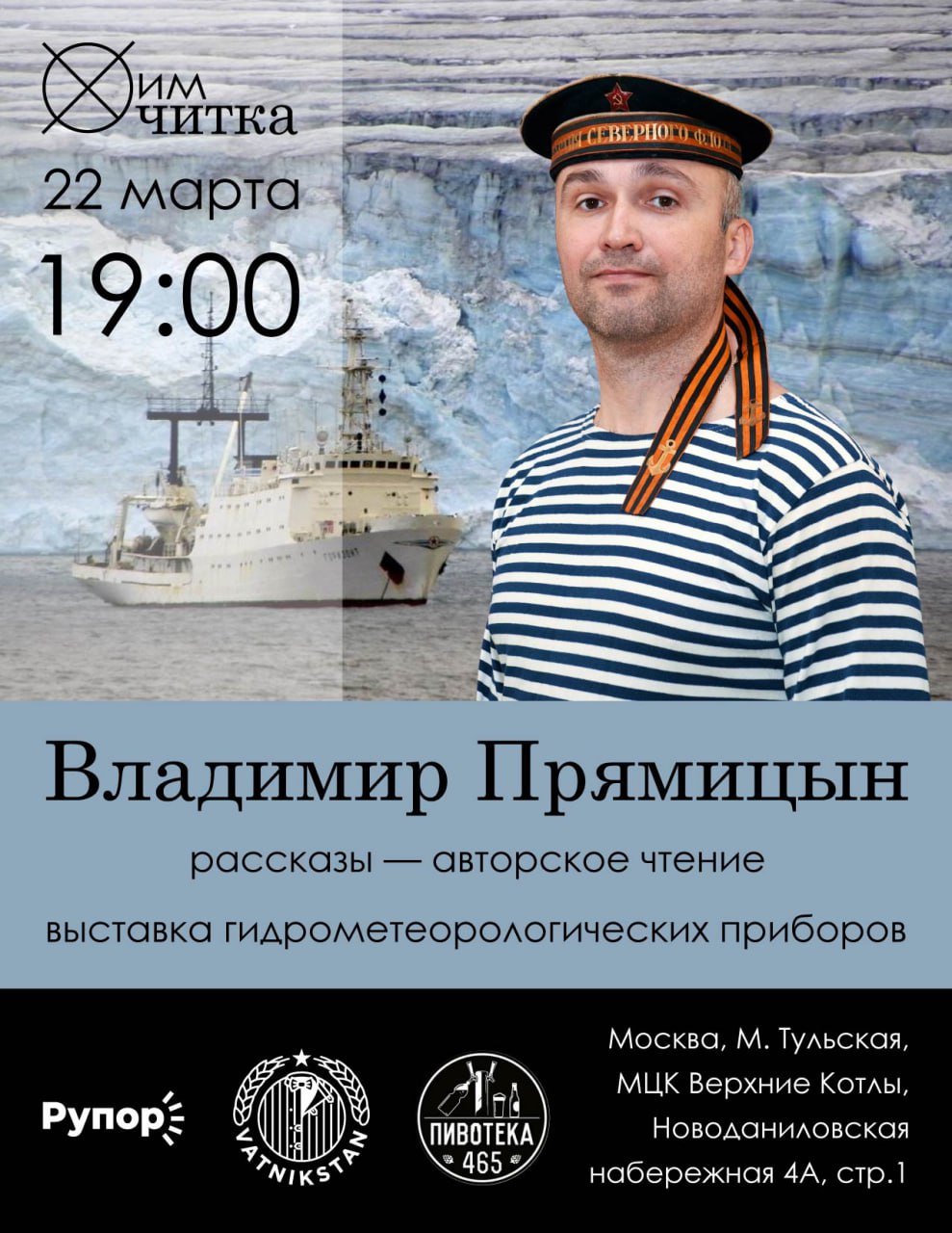 Владимир прочитает несколько рассказов о приключениях, быте и курьёзах из жизни моряков, а также продемонстрирует коллекцию гидрометеорологических измерительных приборов. После официальной части можно будет поговорить с гостем в неформальной обстановке.