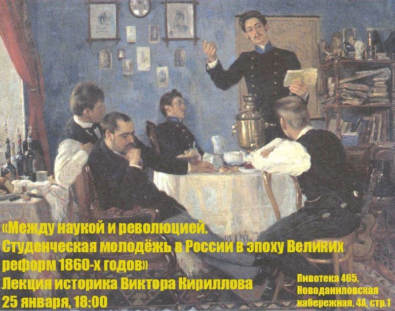 25 января книжный магазин «Рупор» проведёт лекцию историка Виктора Кириллова «Между наукой и революцией. Студенческая молодёжь в России в эпоху Великих реформ 1860-х годов».